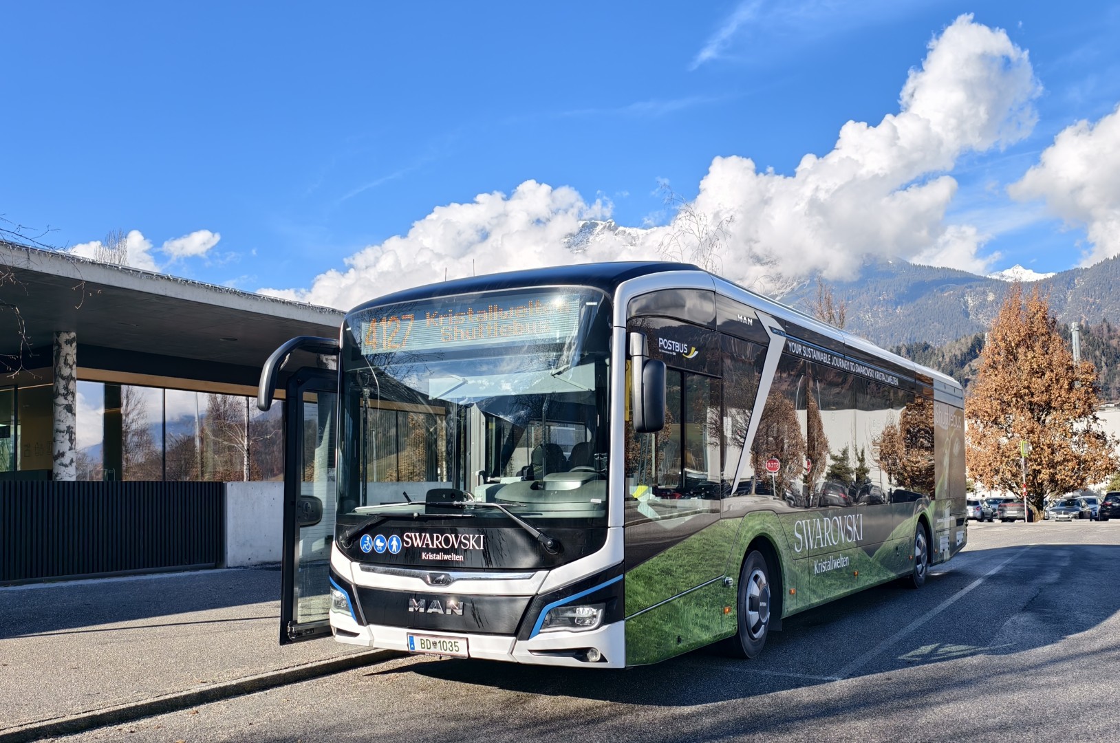 BD 1035 - erreicht hier in Wattens als Kristallwelten Shuttlebus die Swarovski Kristallwelten. Dieser MAN Lion's City 12 E-Bus verkehrt 6 mal pro